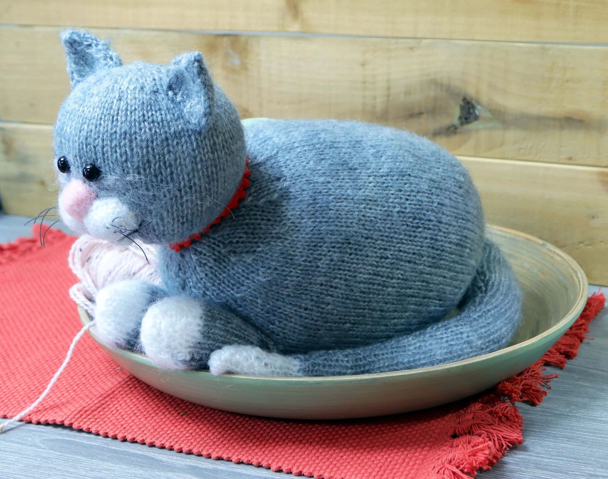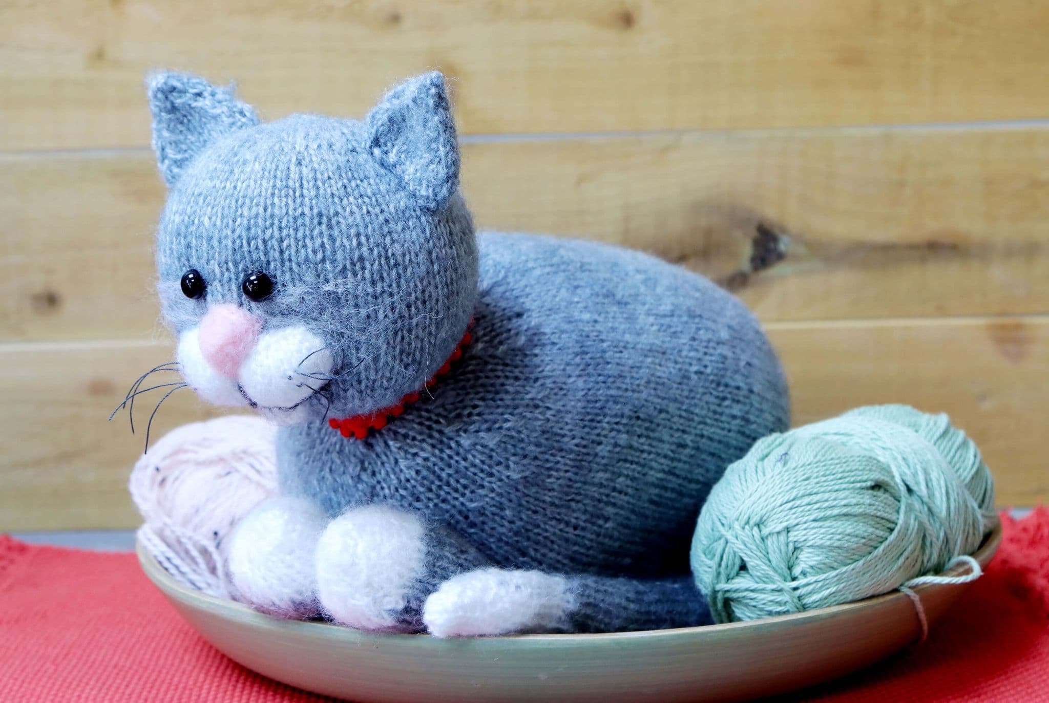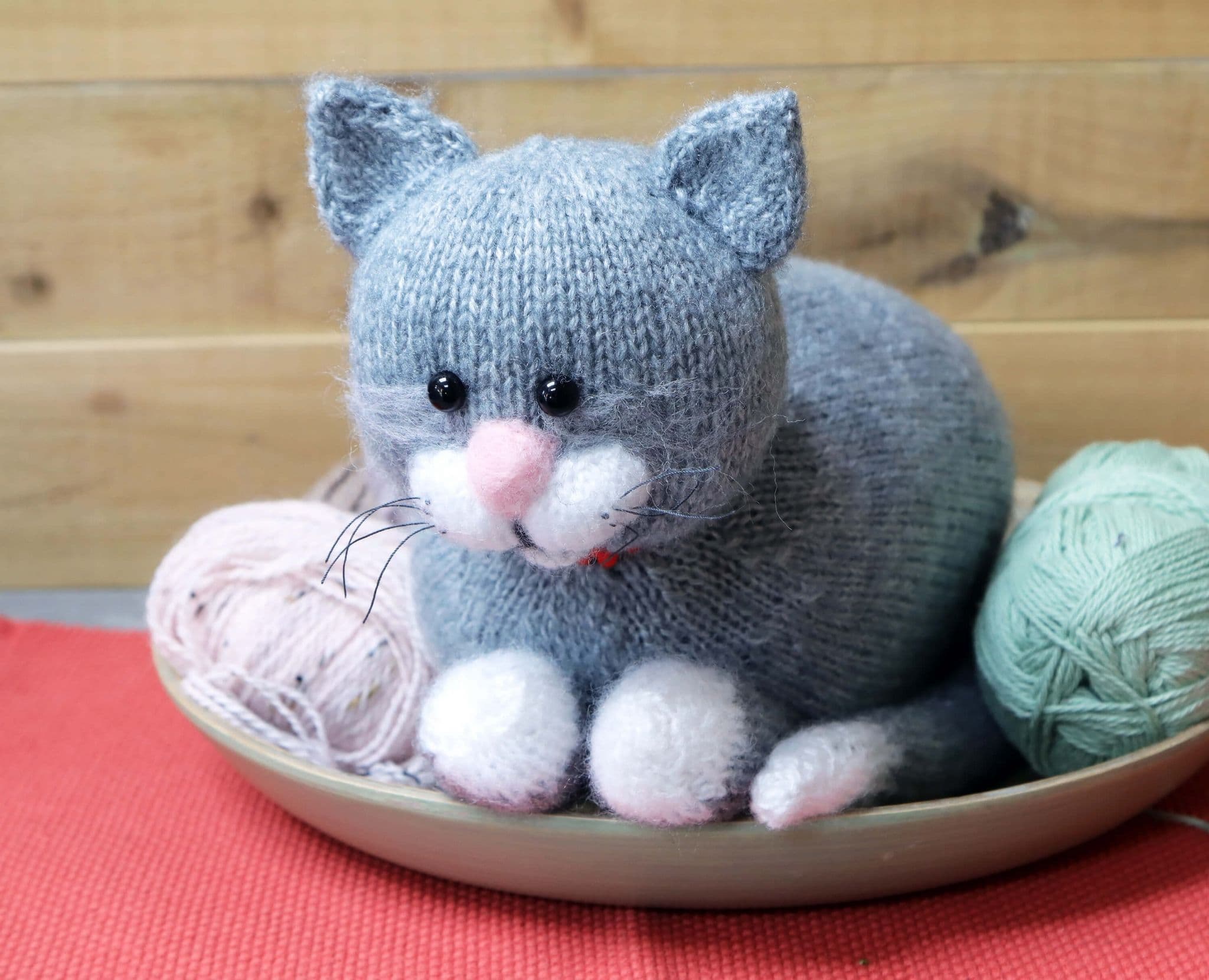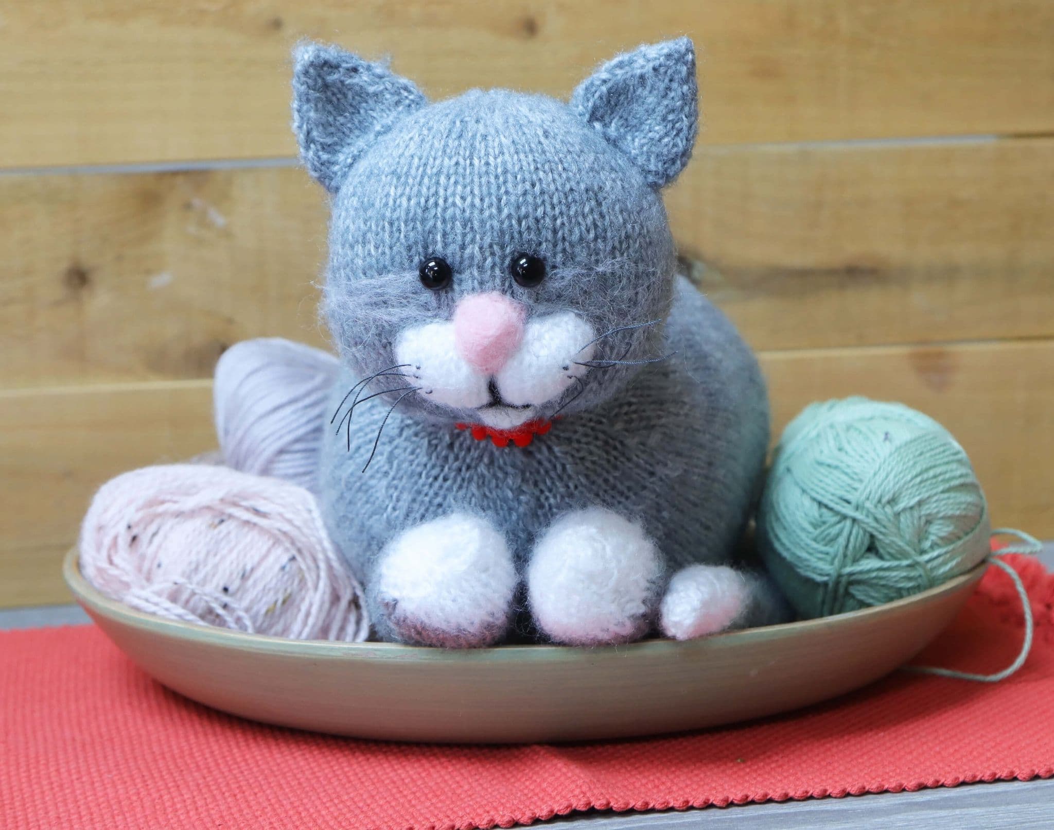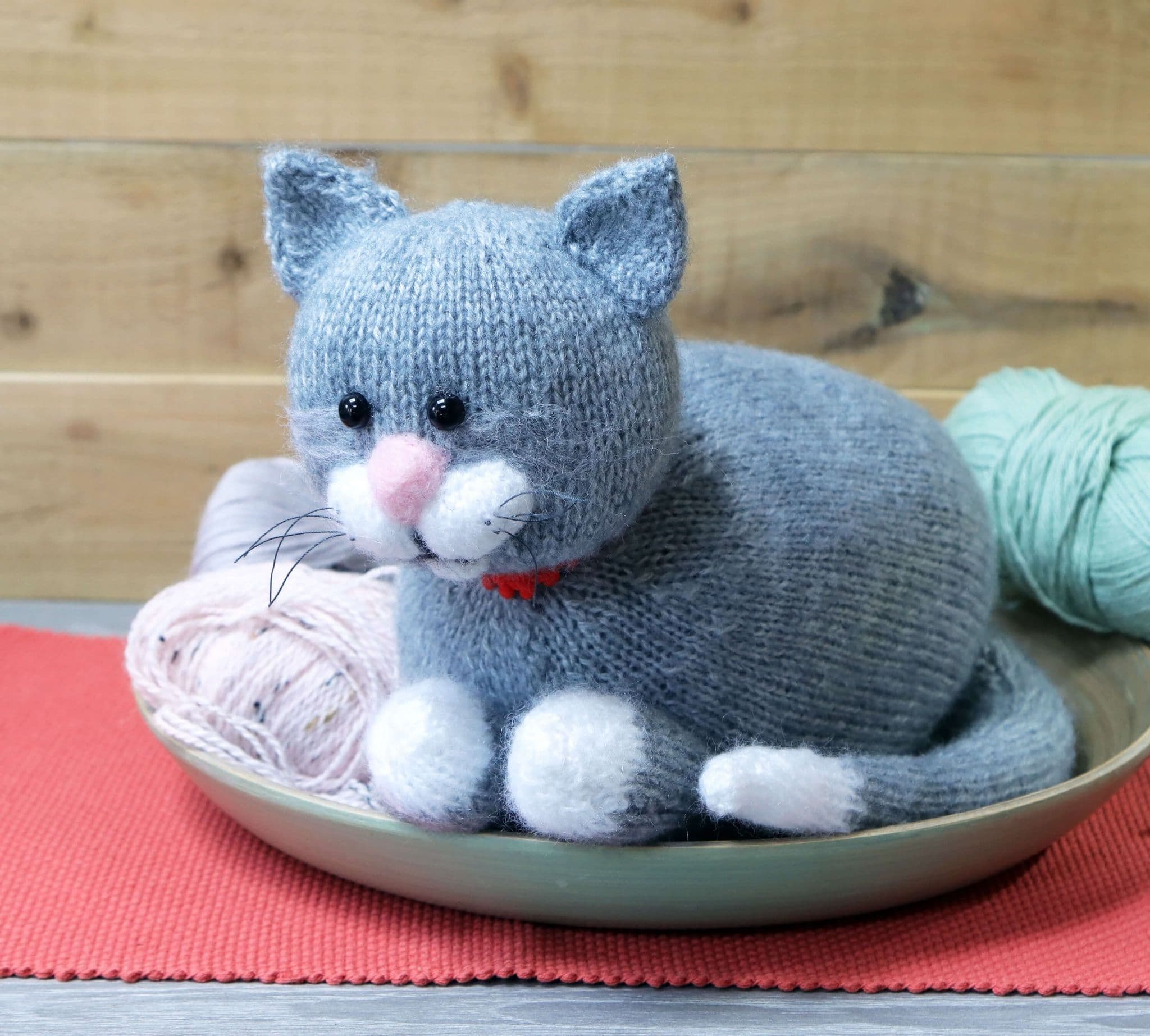 A must for cat lovers, this irresistibly cute knitted cat soft toy. Made with soft grey yarn, this charming kitty features a pink nose, black button eyes, and a grey tail with a white tip. He also has white tipped paws, grey ears and a red collar.