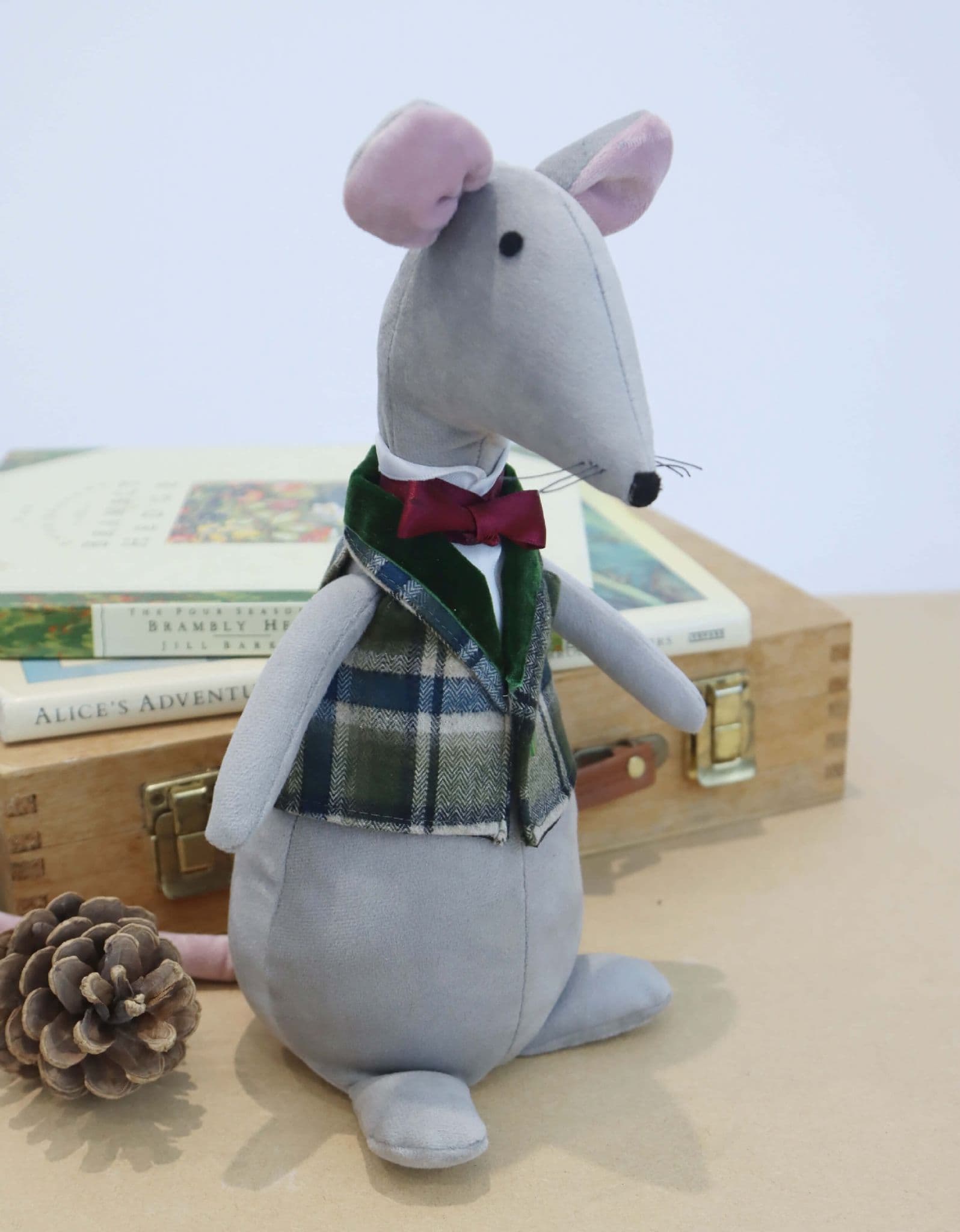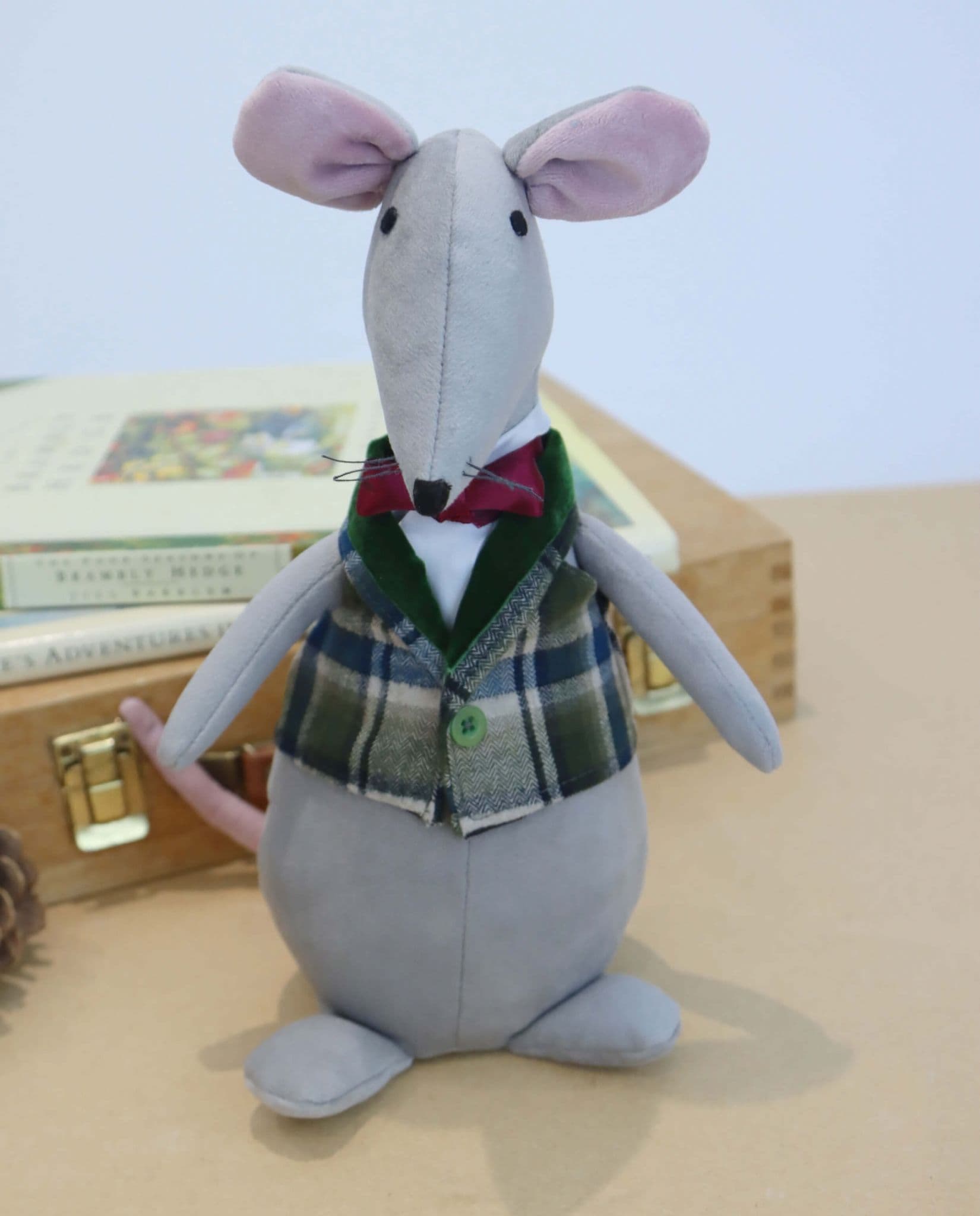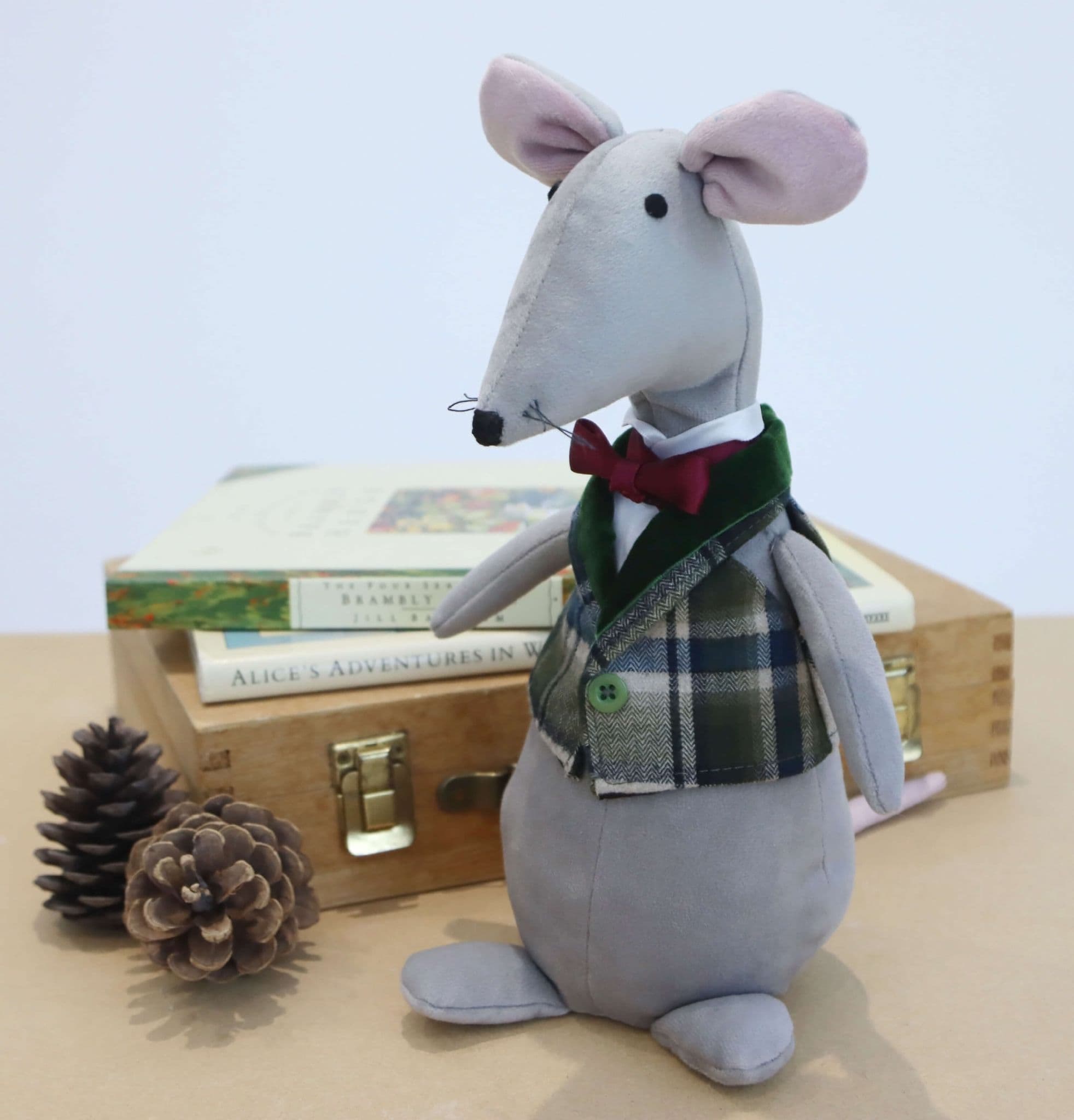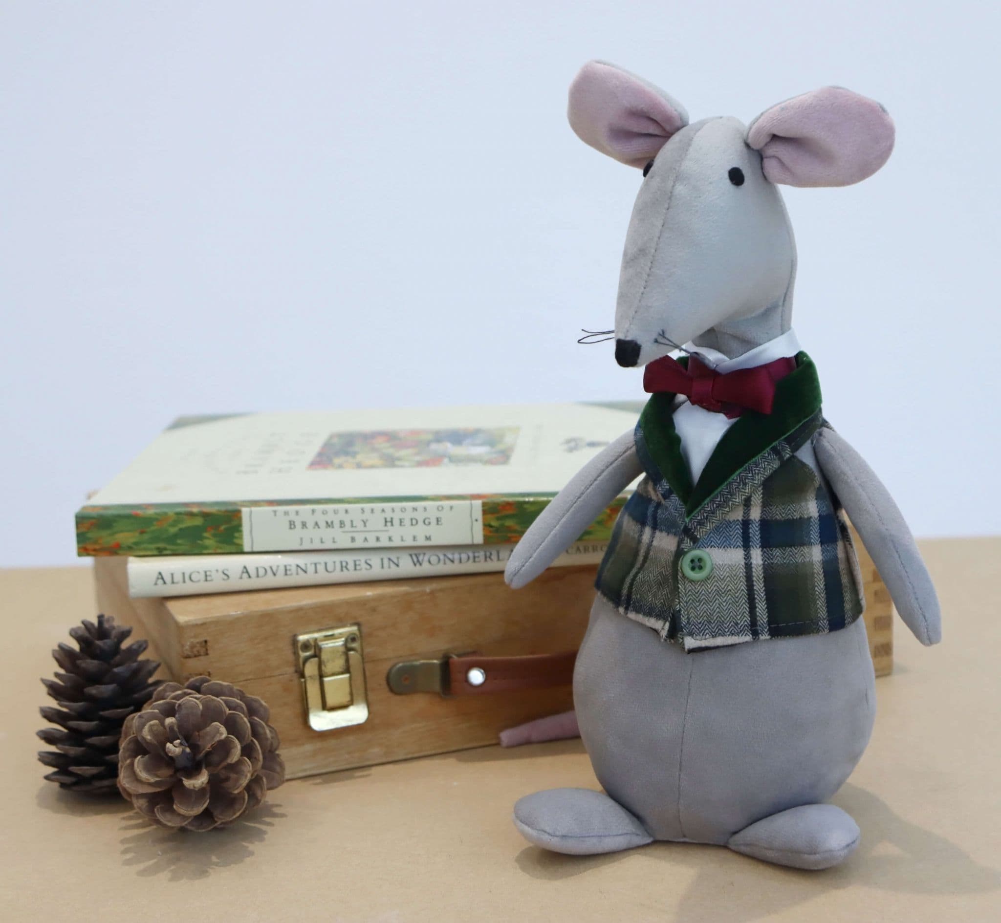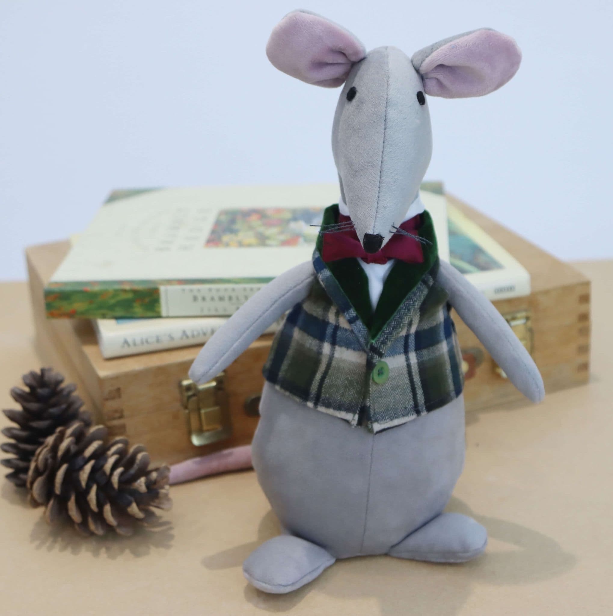 Adorable plush gentleman mouse made with soft grey velour fabric.